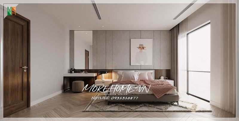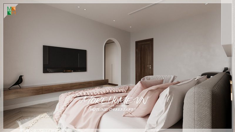 Bố trí phòng ngủ Master tại chung cư hiện đại, các chi tiết nội thất đơn giản, mềm mại mà không quá rối mắt, gò bó tạo cảm giác thoải mái
