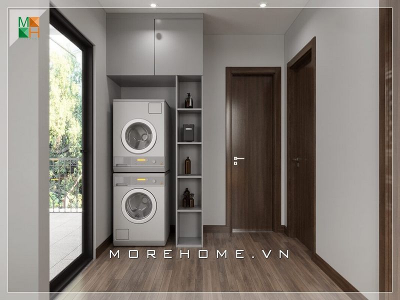 Phòng giặt đồ đẹp được thiết kế tiện lợi với tử chứa hiện đại trong một không gian thoáng đãng sát cửa kính rộng đầy ánh sáng.