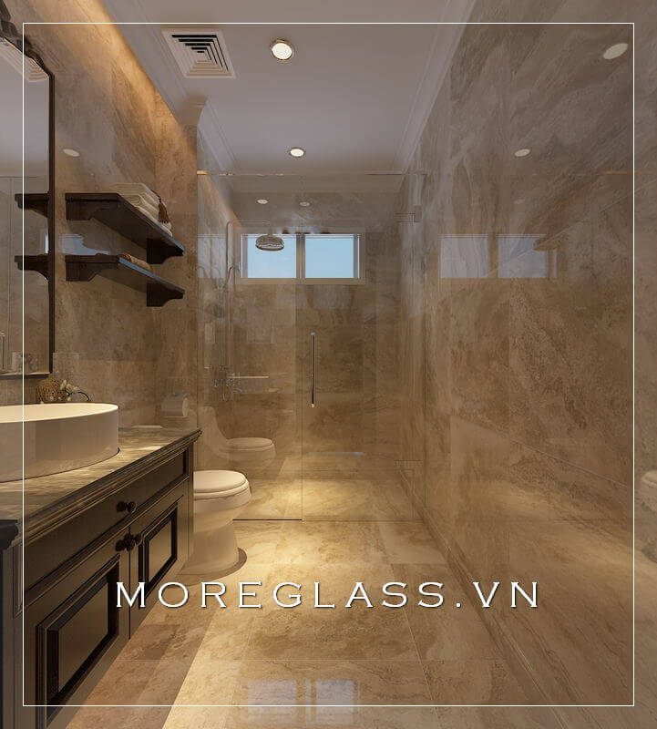 Sử dụng đá tự nhiên cao cấp, ốp nền và tường kết hợp với vách kính tắm cường lực, chúng tôi sẽ tạo ra một không gian hoàn hảo trong từng chi tiết cho mẫu thiết kế phòng tắm đẹp của bạn và phân cách hai không gian nhà vệ sinh và phòng tắm.