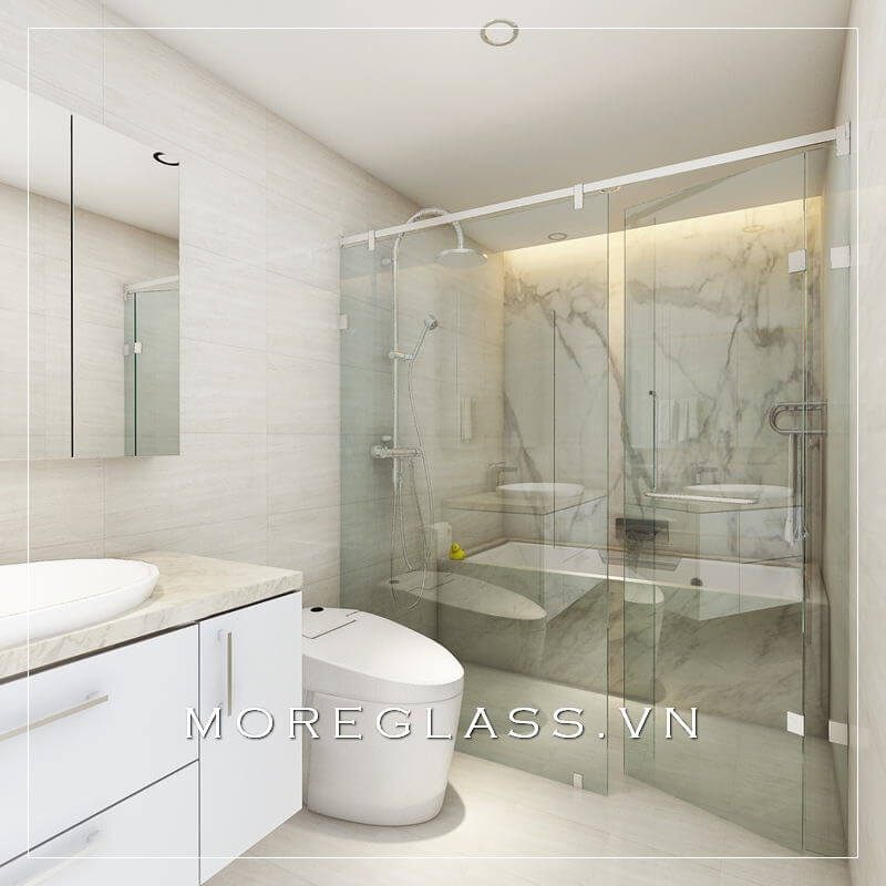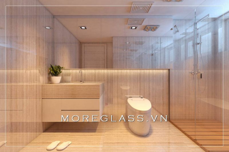 Mẫu thiết kế phòng tắm hiện đại, được bao bọc trong một bức kính trong suốt, để lọc tất cả các ánh nhìn.