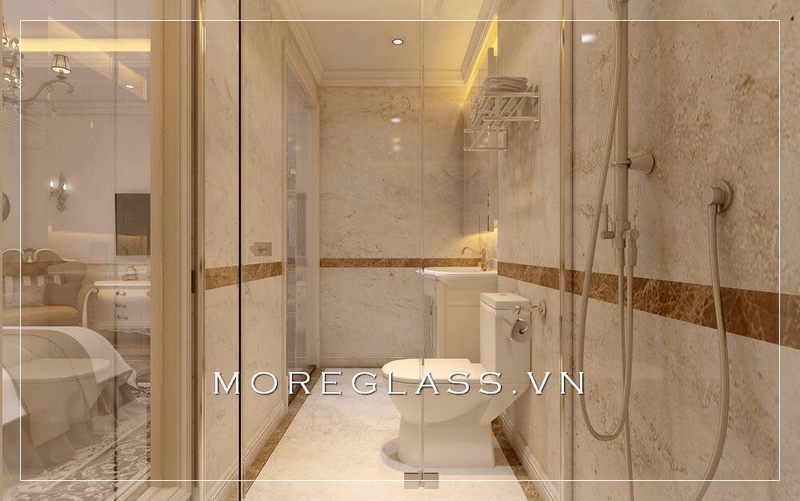 Phòng ngủ khách sạn cao cấp được trang bị mẫu phòng tắm kính cường lực cao cấp với nhiều tiện nghi đầy đủ.
