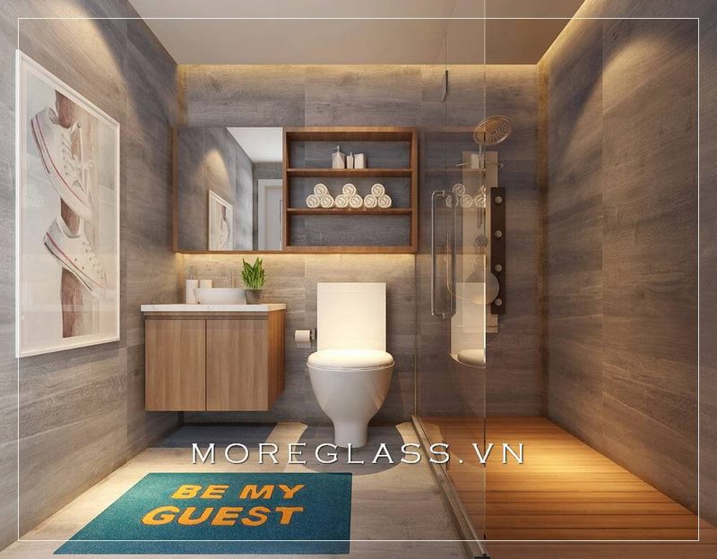 Mẫu thiết kế nhà vệ sinh hiện đại của chung cư đã kết hợp với phòng tắm kính cường lực cao cấp, giúp tạo ra không gian tiện nghi và thoải mái mà không bị chật trội.