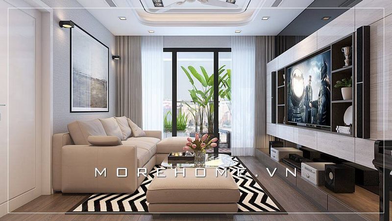 Kiến trúc sư Morehome áp dụng các hình khối đơn giản và cụ thể để thiết kế một phòng khách chung cư đẹp, giúp gia chủ có trải nghiệm thuận tiện và rõ ràng hơn.
